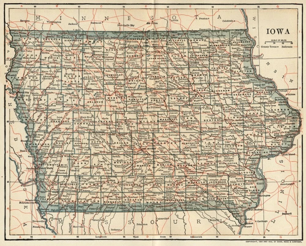 IOWA Map: Genuine 1891 and 1902 (dated) Towns Counties Topopgraphy