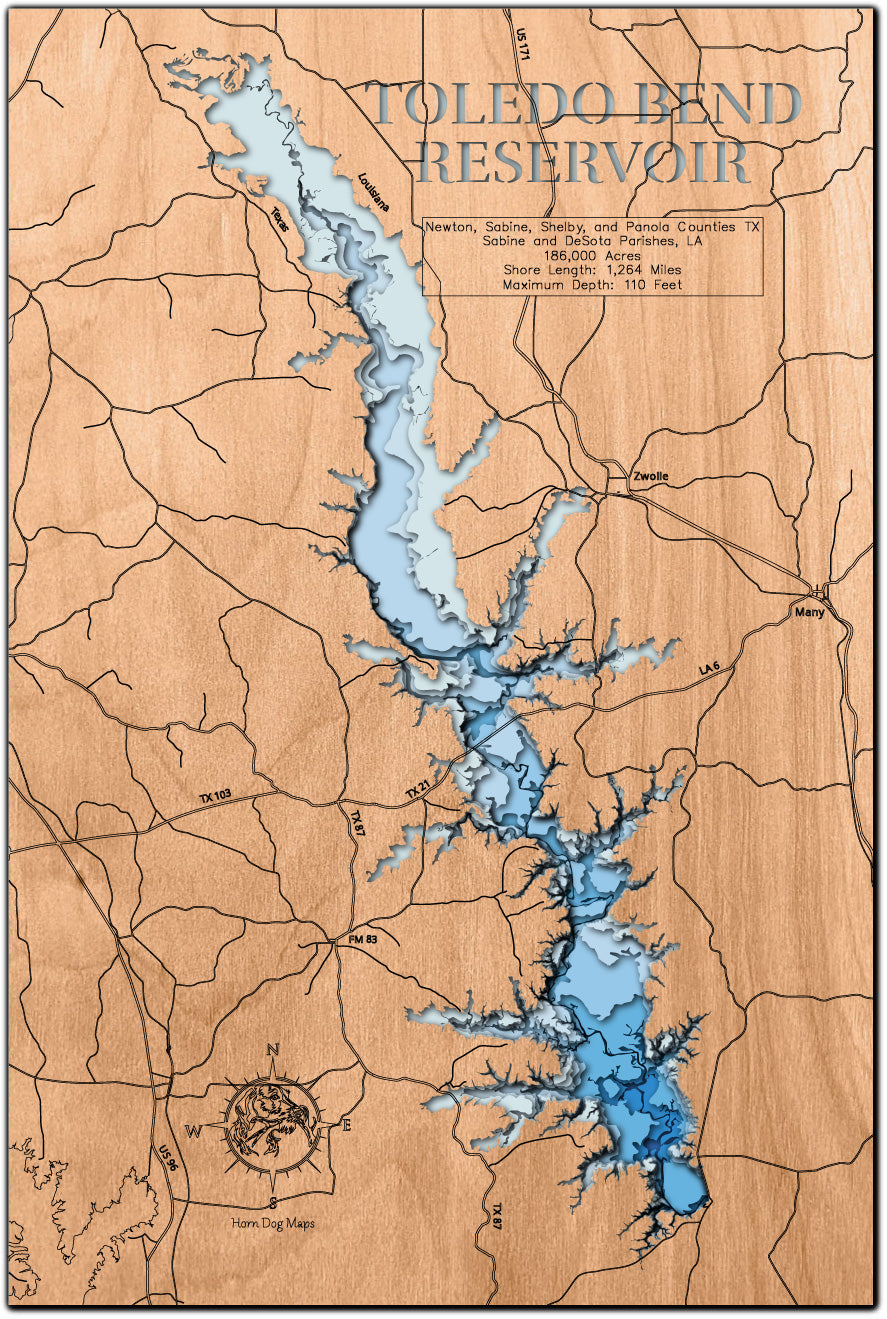 Toledo Bend Reservoir, TX 3D Wooden Map | Topographic Wood