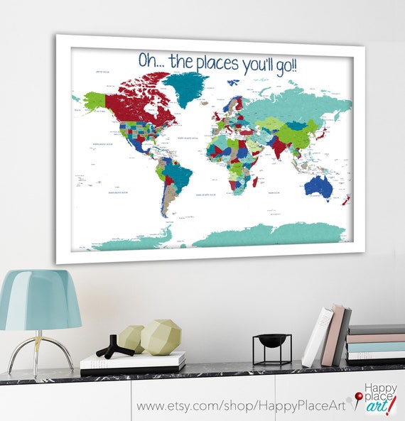 Educational Map Print, Bright Colours, Push Pin World Map With